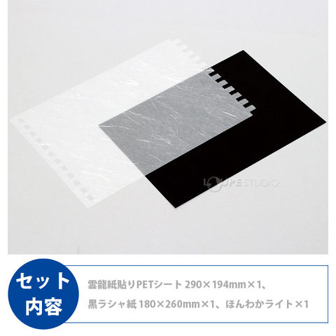 | セット内容 | 雲龍紙貼りPETシート 290×194mm×1、黒ラシャ紙 180×260mm×1、ゆらぎ灯×1 |