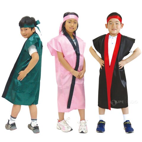 肌ざわりの良いサテン生地を使用したロングタイプのハッピです。サテン特有の光沢のあるきれいな色で、応援や演舞などを華やかに演出します。ハチマキ付きなので統一感が出ます。カラーが豊富なので、クラスやチーム、グループごとに色分けできます。運動会、発表会、イベントなど幅広いシーンで使えます。幼児~小学校低学年向けのサイズです。