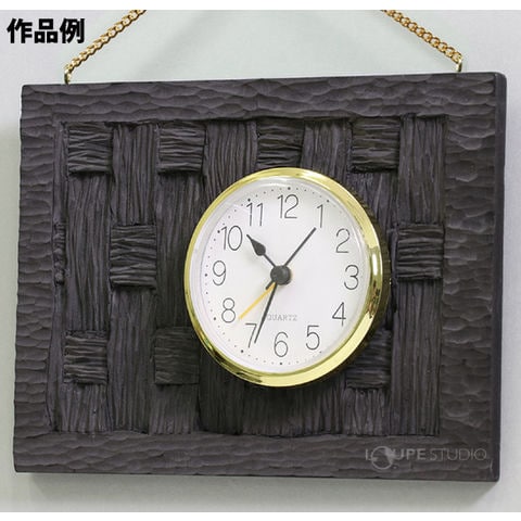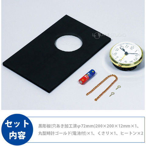 | セット内容 | 黒彫板(穴あき加工済φ72mm)200×200×12mm×1、丸型時計ゴールド(電池付)×1、くさり×1、ヒートン×2 |