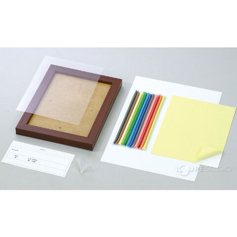 セット内容:砂絵用のり付シート×1、木目調フレーム×1、砂おとし用敷紙 A4×1、カラー砂13色組(4g×13本)×1、ミニジョウゴ×1、名前札×1