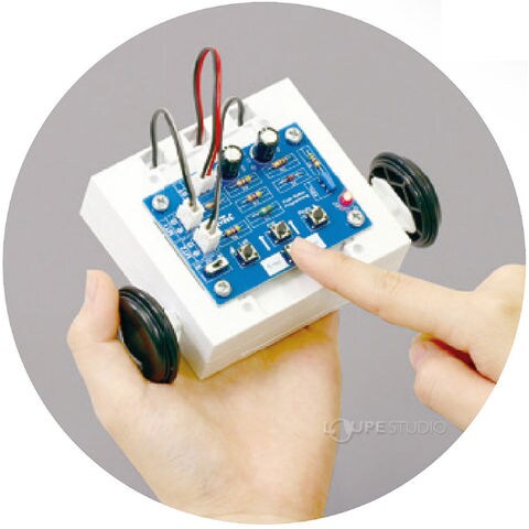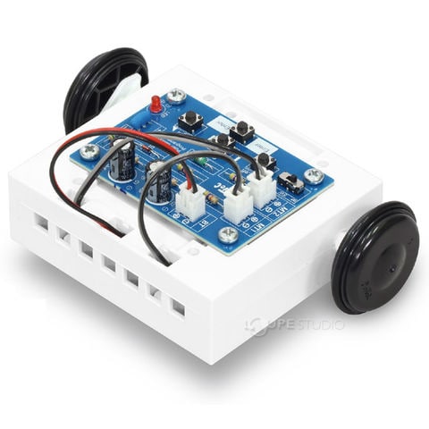 | セット内容 | メイン基板×1、モータ付ロボット台座×1、ジョイントパーツ×2、タイヤ×2、タイヤ用ゴム×2、ネジ (φ4×5mm)×4、電子パーツ台紙×1、ボタンスイッチ×4、ON/OFFスイッチ×1、セラミック発振子×1、LED×1、ハンダ×1 |