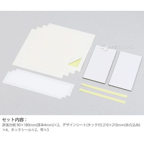 | セット内容 | 屏風台紙 90×180mm(厚み4mm)×2、デザインシート(タック付) 210×210mm(余白込み)×4、タックシール×2、帯×3 |
