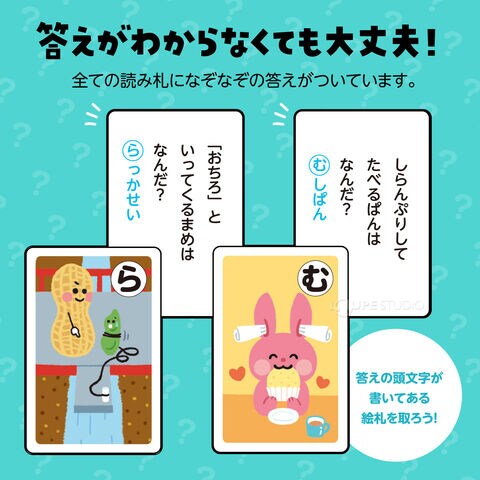 なぞなぞが盛りだくさんの楽しいかるたです。45種類のなぞなぞが出題されます。なぞなぞを解きながら、楽しくかるた遊びができます。