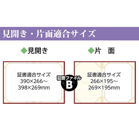 | 証書適合サイズ | 全面使用時:390×266~398×269mm 片面使用時:266×195~269×195mm |