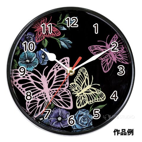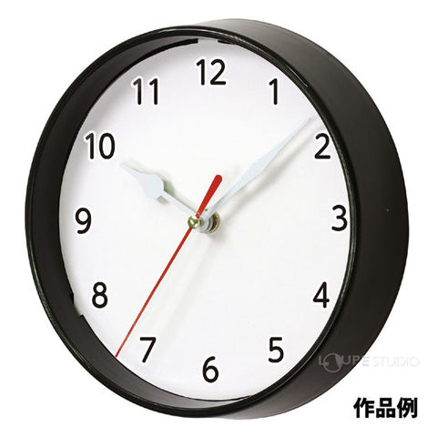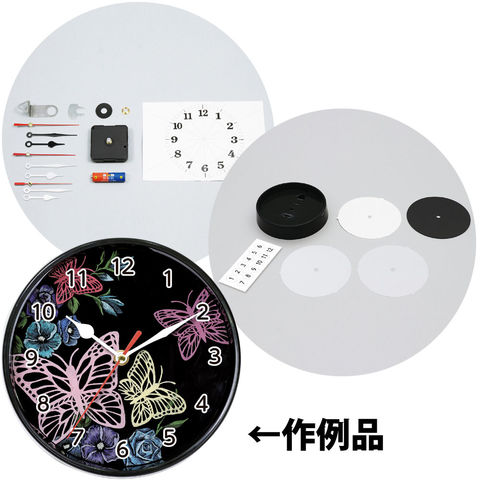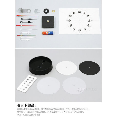 | セット部品 | 本体(φ180×40mm)×1 PET透明板(φ158mm)×2 ケント紙(φ158mm)×1 文字盤シール(70×190mm)×1 アクリル製アートガラス(φ157mm)×1 クォーツ時計Aセット×1 |