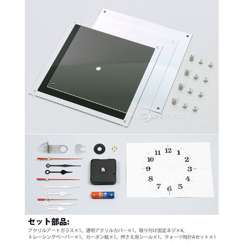 | セット部品 | アクリルアートガラス×1 透明アクリルカバー×1 取り付け固定ネジ×4 トレーシングペーパー×1 カーボン紙×1 押さえ用シール×1 クォーツ時計Aセット×1 |
