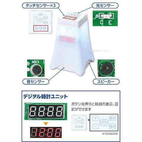 | セット部品 | 本体×1 USBケーブル×1 LED基板×1 タッチセンサー基板×1 フルカラーLED×4 デジタル時計ユニット×1 抵抗×3 スペーサー×2 ねじ×10 |