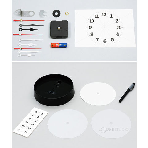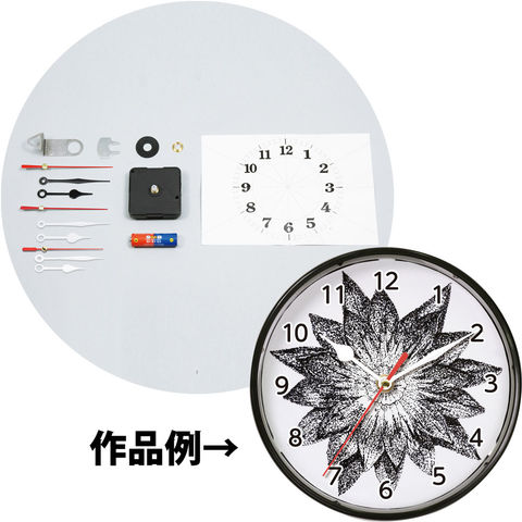 | セット部品 | 本体/φ180×40mm×1、PET透明板/φ158mm×2、ケント紙/φ158mm×1、文字盤シール(透明)/70×190mm×1、クォーツ時計Aセット×1、油性ミリペン0.4mm×1 |