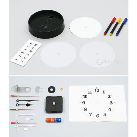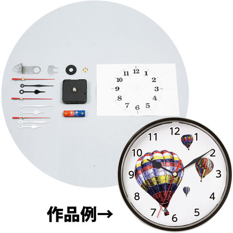 | セット部品 | 本体/φ180×40mm×1、PET透明板 φ158mm×2、ケント紙/φ158mm×1、文字盤シール(透明)/70×190mm×1、クォーツ時計Aセット×1、油性ミリペン0.4mm 3本(赤、青、黄)×1 |