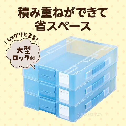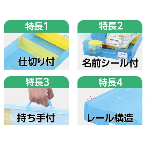 仕切り付きで中身が整理しやすい、A4サイズのおどうぐばこです。クリア素材なので中身がひと目でわかり、どこに何が入っているかもすぐに確認できます。持ち手付きで持ち運びやすく、名前シールもついているので管理も簡単です。中はレール構造で開け閉めもスムーズ。積み重ねができるので、収納スペースも有効に使えます。学校やご家庭で、幅広く活躍するアイテムです。