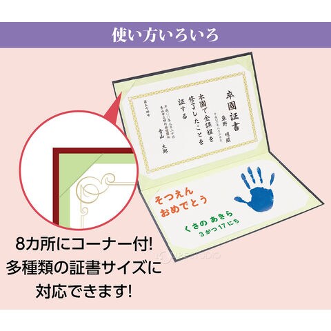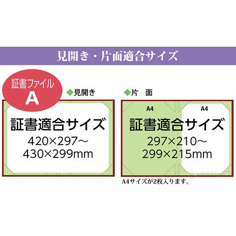 | 証書適合サイズ | 全面使用時:420×297~430×299mm 片面使用時:297×210~299×215mm(A4サイズ対応) |