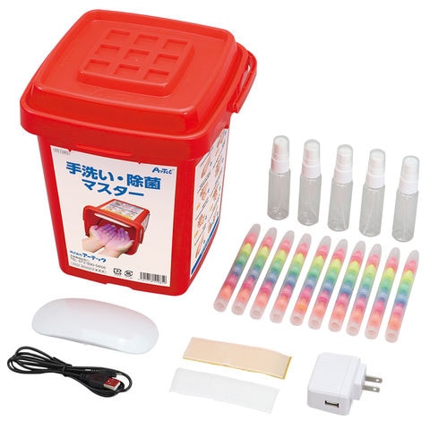 | セット内容 | UVライト×1、蛍光クレヨン(6色)×10、USB充電アダプタ×1、スプレー容器(25ml)×5、バケツ大×1、面ファスナー×1、シール(2枚印刷)×1、説明書×1 |