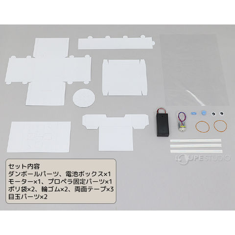 | セット内容 | ダンボールパーツ、電池ボックス×1、モーター×1、プロペラ固定パーツ×1、ポリ袋×2、輪ゴム×2、両面テープ×3、目玉パーツ×2 |