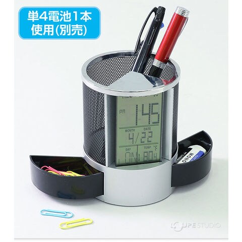 ペン立て時計[小物入れ付] 小物入れ ペンスタンド おしゃれ オフィス シンプル 時計付きスペック