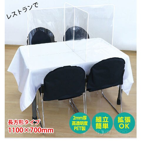 店舗やオフィスのウイルス対策に!●十字型の4人用パーテーション●拡張性に優れており、6人用、8人用など用途に応じてパーテーションを追加できます●透明度の高いPET素材でアルコールや\n 洗剤での清拭が可能\n●平たくたたんだ状態で保管できます。●角R加工で、安心・安全。アクリルより割れにくい!●2mm厚高透明度PET製●組立簡単●拡張OK!単品パーツ追加で連結できます。6人がけ、8人がけにも!