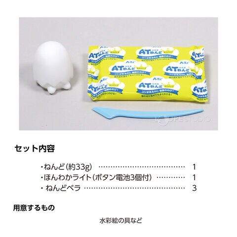 | セット内容 | ねんど(約33g)×1、ほんわかライト(AG13ボタン電池3個付※テスト電池の為、すぐに電池交換をしないといけない場合もあります。LR44ボタン電池も使用可能です。)×1、ねんどベラ×183g |