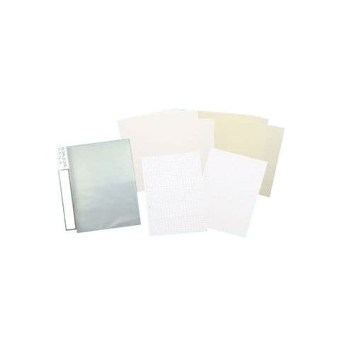 セット内容クリアリングファイル8切(390×300×22mm)×1冊、画用紙(158.1g)×10枚、クロッキー用紙クリーム63.6g×10枚、正方眼紙(5mm)/正方眼紙(10mm)両面×1枚、斜方眼(縦)/斜方眼(横)両面×2枚、PPクリアポケットファイル×2枚