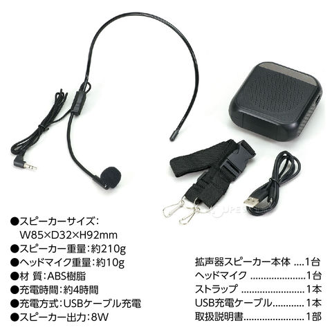 ハンズフリー 小型拡声器 黒 拡声器 小型 マイク付き ヘッドマイク おすすめ usb 会議 受付スペック