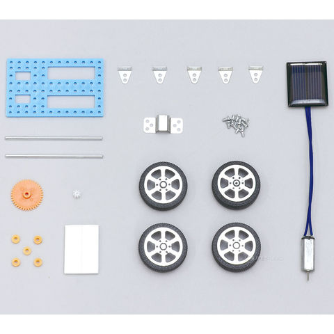 | セット内容 | ベース×1、車軸×2、ギヤ大×1、ピニオンギヤ×1、スペーサー×5(内予備1)、金具A×5(内予備1)、金具B×1、タイヤ×4、ねじ×12(内予備2)、太陽電池用シール×1、モーター付き太陽電池×1 |