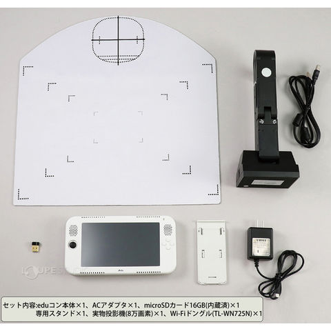 | セット内容 | eduコン本体×1、ACアダプタ×1、microSDカード16GB(内蔵済)×1、専用スタンド×1、実物投影機(8万画素)×1、Wi-Fiドングル(TL-WN725N)×1 |