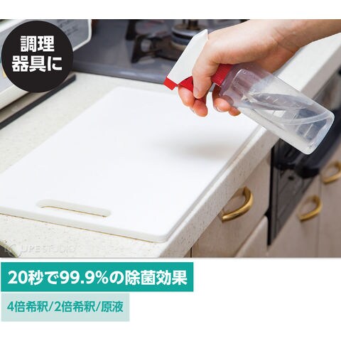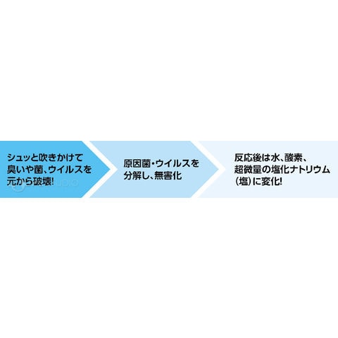 | 使用方法 | 標準使用量/【希釈4倍】原液1/水3(マスクや衣類、ドアノブ・手すり・机等の身の回り品) 【希釈2倍】原液1/水1(臭いの気になる空間の除菌・消臭) 【原液】(住居内の除菌消臭、排水溝等の頑固な臭いの除菌消臭) 直接スプレーし、気になる場合はその後乾いた布で拭いてください。 直接スプレーできない場合は、布にスプレーして拭いてください。 |