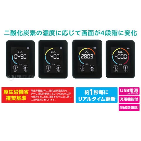 二酸化炭素の濃度に応じて画面が4段階に変化約1秒毎にリアルタイム更新CO2、温度、湿度
