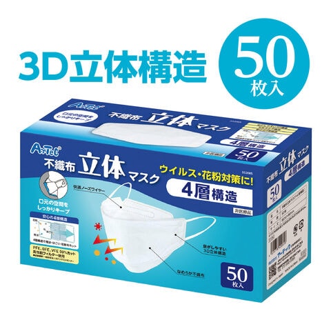 立体マスク 不織布 4層 50枚入 息がしやすい 息苦しくない 息楽 使い捨て 3d