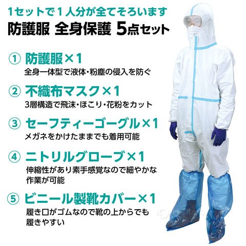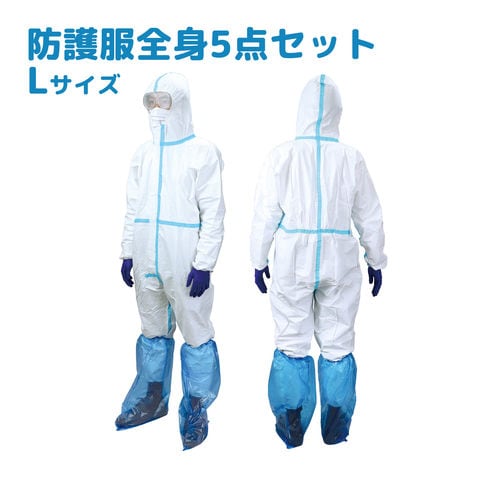 防護服 使い捨て 全身保護5点セットL 保護服 作業着 ウイルス対策 セーフティーゴーグル 保護メガネ 不織布マスク ニトリルグローブL 使い捨てビニール製靴カバーロング