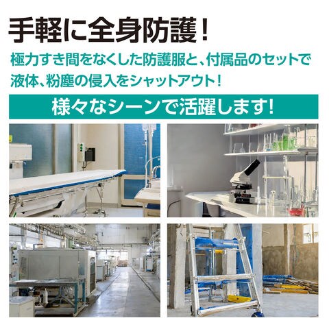 | 商品サイズ | 防護服/総丈約1900×胸囲約1400×袖丈約950mm、上着の裾囲約160mm、ズボンの裾囲約220mm ビニール製靴カバーロング/約340×600mm、ゴム部分90mm 不織布マスク/約175×95mm ニトリル手袋Sサイズ/全長約230mm前後 セーフティゴーグル/180×60×70mm |