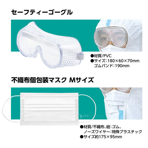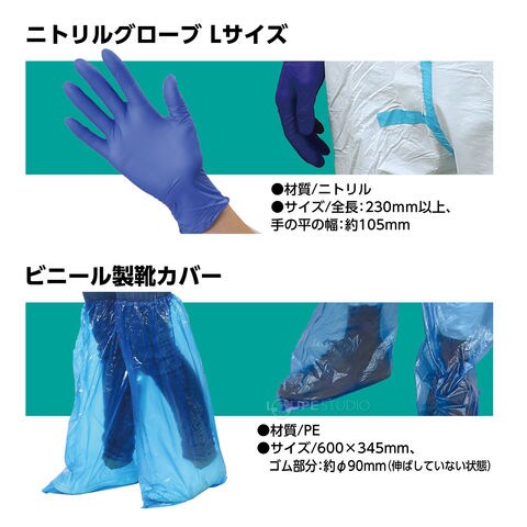 | セット内容 | 防護服L×1、セーフティーゴーグル×1、不織布マスク(個包装)×1、ニトリルグローブL×1組、使い捨てビニール製靴カバーロング×1組 |