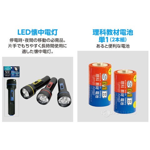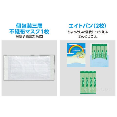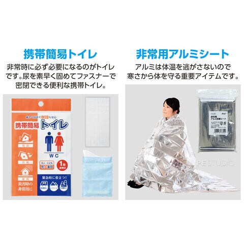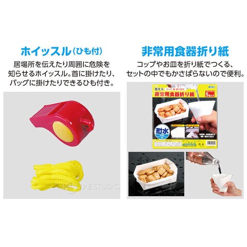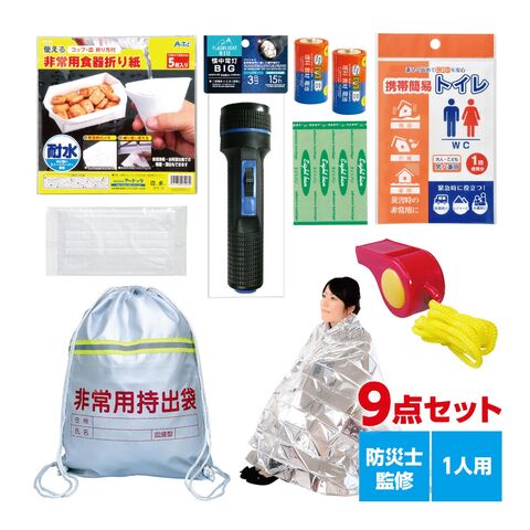 | セット内容 | 非常用持出袋×1、非常用アルミシート×1、ホイッスル(ひも付)×1、携帯簡易トイレ×1、ばんそうこう(2枚)×1、非常用食器折り紙×1、不織布マスク×1、LED懐中電灯×1、単1乾電池(2本組)×1 |