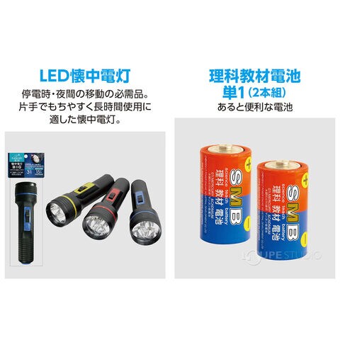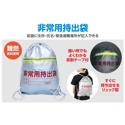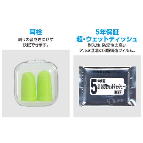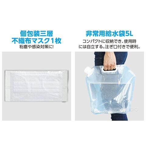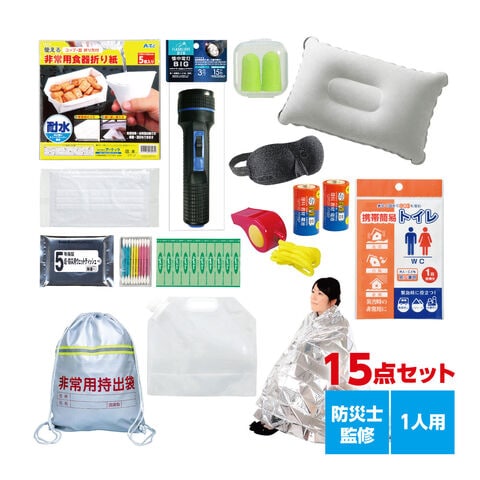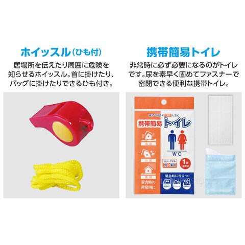 | セット内容 | 非常用持出袋×1、非常用アルミシート×1、ホイッスル(ひも付)×1、携帯簡易トイレ×1、ばんそうこうセット(5枚、綿棒10本)×1、非常用食器折り紙×1、不織布マスク×1、非常用給水袋5L×1、LED懐中電灯×1、単1乾電池(2本組)×1、持ち運び簡単エアー枕×1、立体スポンジアイマスク×1、耳栓×1組、防災用ウェットティッシュ×1 |