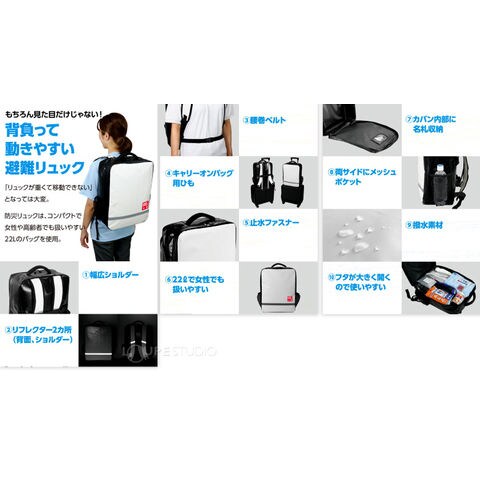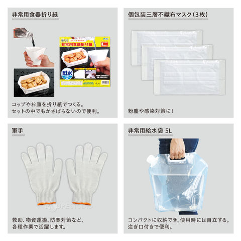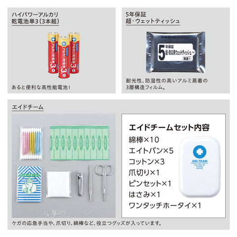 | セット内容 | 防災リュック×1、静音防寒シート(オレンジ)×1、緊急用呼子笛×1、携帯簡易トイレ×2、エイドチーム×1、非常用食器折り紙×1、軍手×1組、不織布マスク×3、非常用給水袋5L×1、2WAYランタンライト×1、ハイパワーアルカリ単3(3本組)×1、持ち運び簡単エアー枕×1、立体スポンジアイマスク×1、耳栓×1組、静音防寒寝袋(オレンジ)×1、歯ブラシ×1、歯磨き粉×1、コップ(2色アソート)×1、不織布スリッパ×1組、ロープ3m×1、防災用ウェットティッシュ×1 |