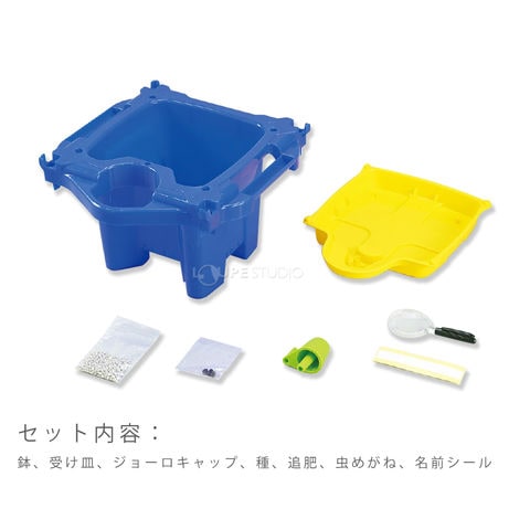 | セット内容 | 鉢、受け皿、ジョーロキャップ、種、追肥、虫めがね、名前シール |