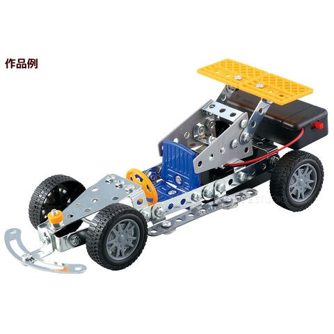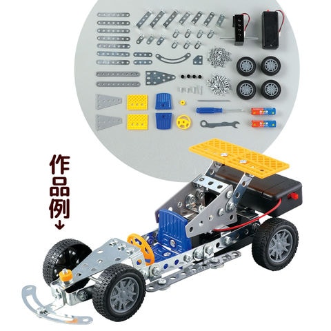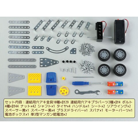 | セット内容 | 連結用穴アキ金具10種×計29 連結用穴アキプラパーツ2種×計4 ボルト 4種×計44 ナット×42 シャフト×1 タイヤ×4 ハンドル×1 シート×2 リアウイング×2 スペーサー黄×1 スペーサー黒×4 プラスドライバー×1 スパナ×1 モーターパーツ×1 電池ボックス×1 単3型マンガン乾電池×2 |