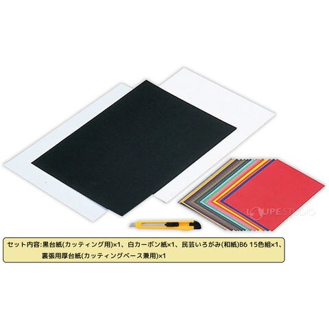 | セット内容 | 黒台紙(カッティング用)×1、白カーボン紙×1、民芸いろがみ(和紙)B6 15色組×1、裏張用厚台紙(カッティングベース兼用)×1 |