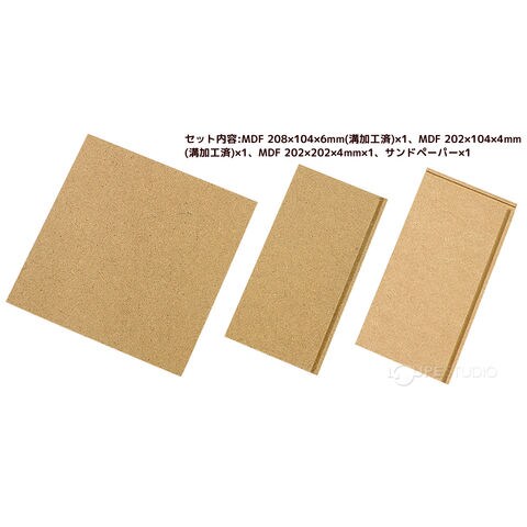 | セット内容 | MDF 208×104×6mm(溝加工済)×1、MDF 202×104×4mm(溝加工済)×1、MDF 202×202×4mm×1、サンドペーパー×1 |