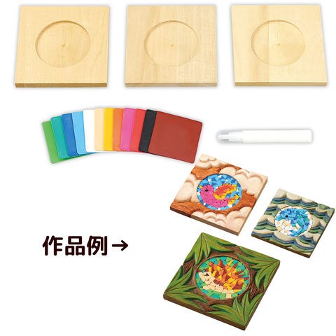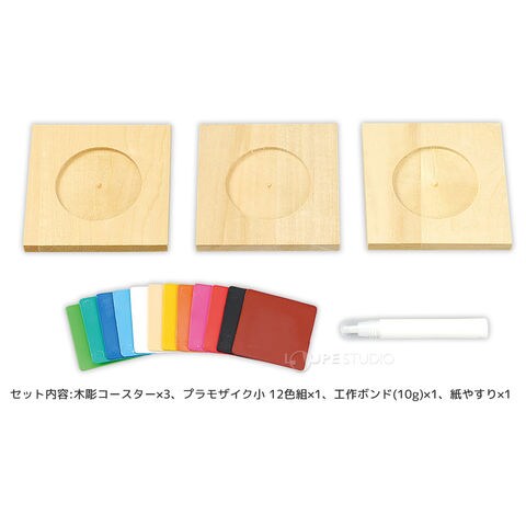 | セット内容 | 木彫コースター×3、プラモザイク小 12色組×1、工作ボンド(10g)×1、紙やすり×1 |
