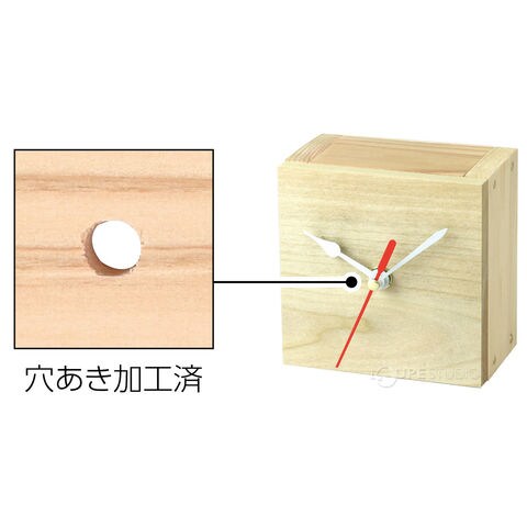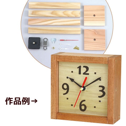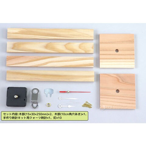 | セット内容 | 木部(15×30×250mm)×2、木部(10cm角穴あき)×1、手作り時計キット用クォーツ時計×1、釘×10 |