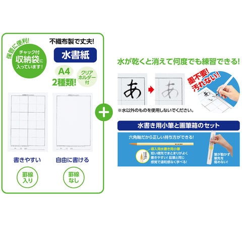 | セット内容 | 水書紙(罫線入り、罫線なし)×各1、導入用水書き用小筆×1、画筆箱 ×1、クリアホルダー×1 |