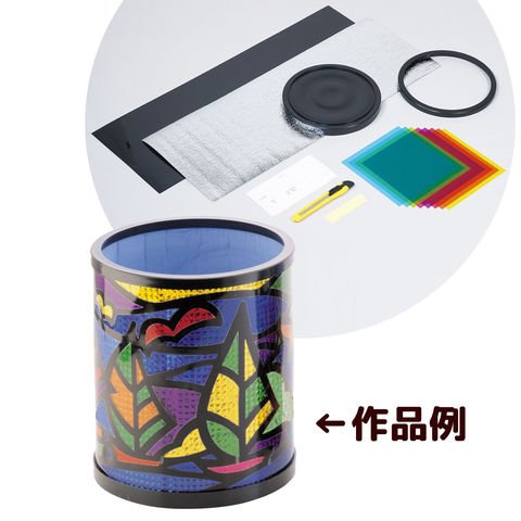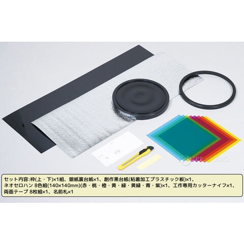 | セット内容 | 枠(上・下)×1組、銀紙裏台紙×1、創作黒台紙(粘着加工プラスチック板)×1、ネオセロハン 8色組(140×140mm)(赤・桃・橙・黄・緑・黄緑・青・紫)×1、工作専用カッターナイフ×1、両面テープ 8枚組×1、名前札×1 |