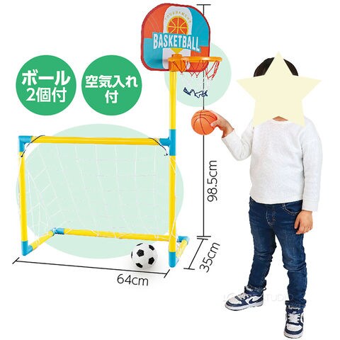 | セット内容 | バスケットゴール×1、パイプ×7、ジョイントパーツ×6、サッカーボール×1、バスケットボール×1、ネット×2、空気入れ×1 |