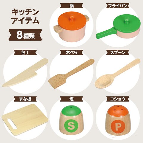 | セット内容 | コンロ×1、まな板×1、鍋×1、フライパン×1、ナイフ×1、ヘラ×1、にんじん×1、トマト×2、レモン×1、ボトル×2 |