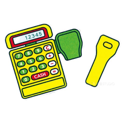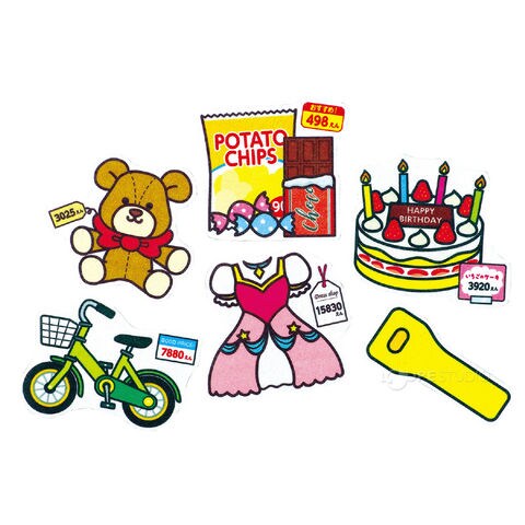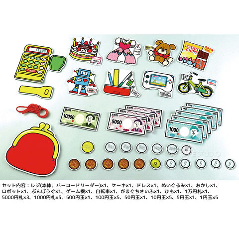 | セット内容 | レジ(本体、バーコードリーダー)×1、ケーキ×1、ドレス×1、ぬいぐるみ×1、おかし×1、ロボット×1、ぶんぼうぐ×1、ゲーム機×1、自転車×1、がまぐちさいふ×1、ひも×1、1万円札×1、5000円札×3、1000円札×5、500円玉×1、100円玉×5、50円玉×1、10円玉×5、5円玉×1、1円玉×5 |