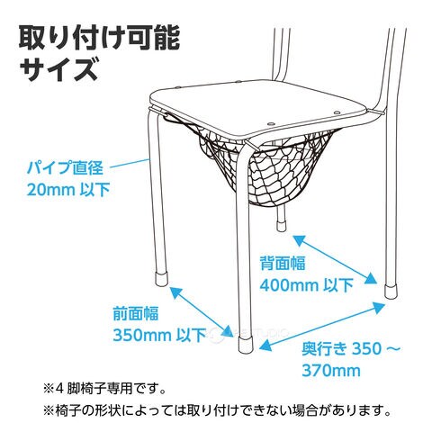 | 取り付け可能サイズ | 椅子の脚パイプ20mm以下、前面約350mm、背面約400mm、奥行約350~370mm(4脚椅子に限る) ※椅子の形状によっては取り付けできない場合があります。 |