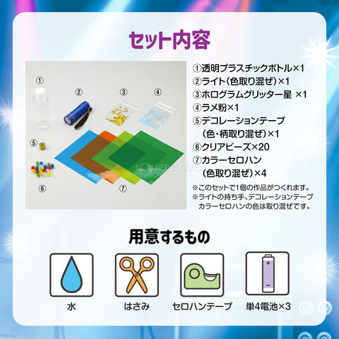 | セット内容 | 透明プラスチックボトル×1、ライト(色は選べません)×1、ホログラムグリッター星×1、ラメ粉×1、デコレーションテープ(色・柄は選べません)×1、クリアビーズ×20、カラーセロハン(色は選べません)×4 |