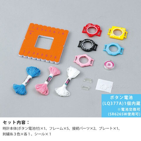 | セット内容 | 時計本体(ボタン電池付)×1、フレーム×5、接続パーツ×2、プレート×1、刺繍糸3色×各1、シール×1 |