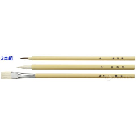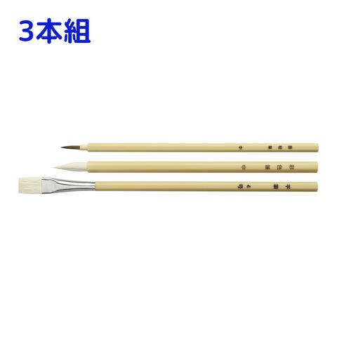 | 商品サイズ | 【面相筆 中】全長/約195mm、穂先/約φ3×15.5mm 【彩色筆 中】全長/約202mm、穂先/約φ6×25mm 【平筆 4号】全長/約230mm、穂先/約13×18mm |