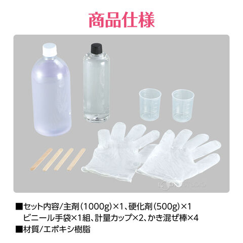 | セット内容 | 主剤1000g、硬化剤500g、ビニール手袋×1組、計量カップ×2個、かき混ぜ棒×4本 |
