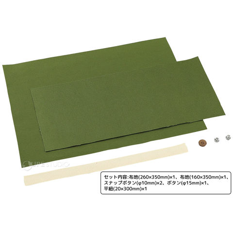 | セット内容 | 布地(260×350mm)×1、布地(160×350mm)×1、スナップボタン(φ10mm)×2、ボタン(φ15mm)×1、平紐(20×300mm)×1 |